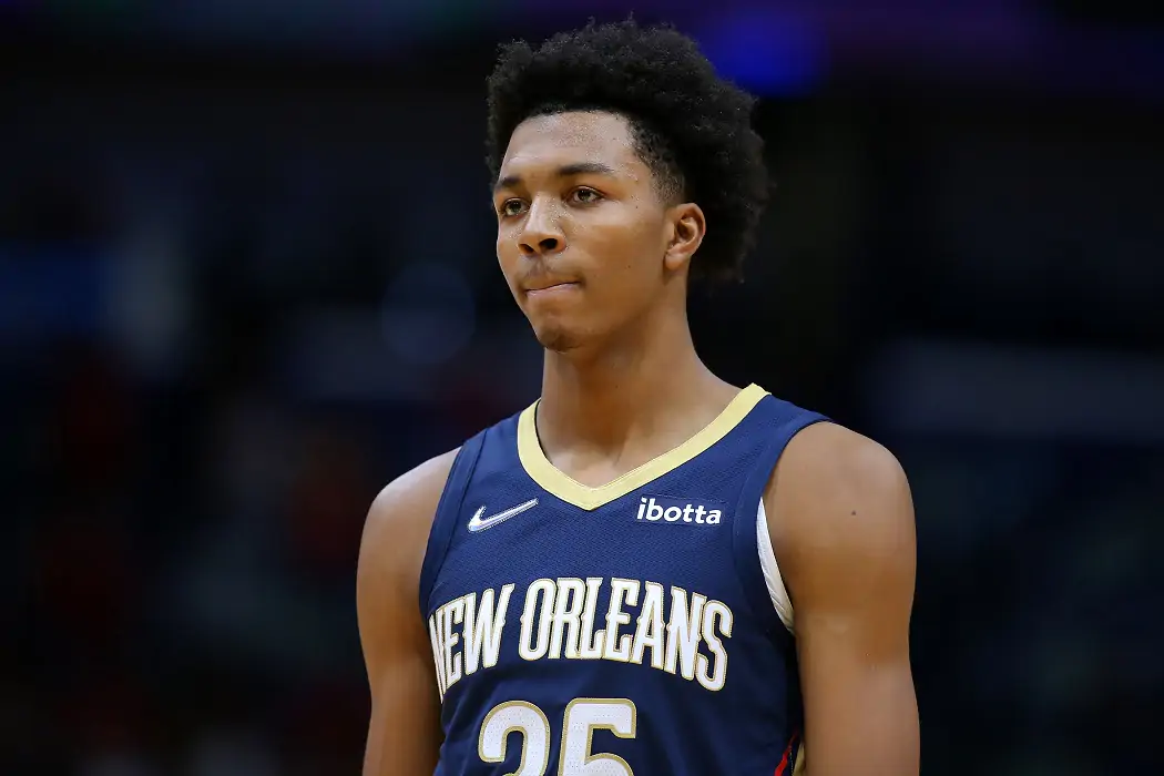 NEW ORLEANS, LOUISIANA - OCTOBER 27: Trey Murphy III #25 of the New Orleans Pelicans reacts against the Atlanta Hawks during the second half at the Smoothie King Center on October 27, 2021 in New Orleans, Louisiana. NOTE TO USER: User expressly acknowledges and agrees that, by downloading and or using this Photograph, user is consenting to the terms and conditions of the Getty Images License Agreement. (Photo by Jonathan Bachman/Getty Images)