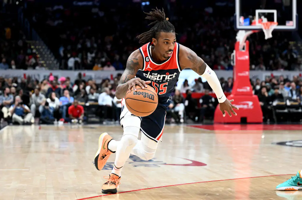 WASHINGTON, DC - MARCH 18: Delon Wright #55 of the Washington Wizards handles the ball against the Sacramento Kings at Capital One Arena on March 18, 2023 in Washington, DC. NOTE TO USER: User expressly acknowledges and agrees that, by downloading and or using this photograph, User is consenting to the terms and conditions of the Getty Images License Agreement. (Photo by G Fiume/Getty Images)