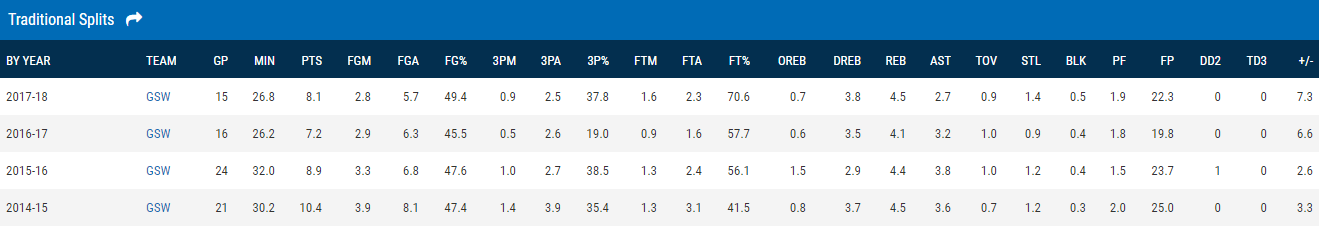 Le statistiche di Iguodala durante le quattro post-season da sogno dei Warriors. Per quanto reggerà questo rapporto elevatissimo tra minuti giocati e qualità?